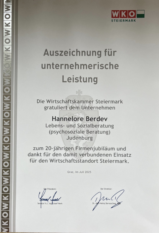 Seit zwei Jahrzehnten begleitet Frau Hannelore Berdev Menschen in herausfordernden Lebenssituationen – als Dipl. psychosoziale Beraterin, zertifizierte Elterntrainerin, Erwachsenenbildnerin und Expertin für Familien- und Beziehungsfragen. Mit einem breiten Spektrum an Angeboten – von Supervision und Selbsterfahrung über Seminare und Workshops bis hin zur Krisenintervention und Suchtkrankenhilfe – steht sie für professionelle, einfühlsame und lösungsorientierte Begleitung.